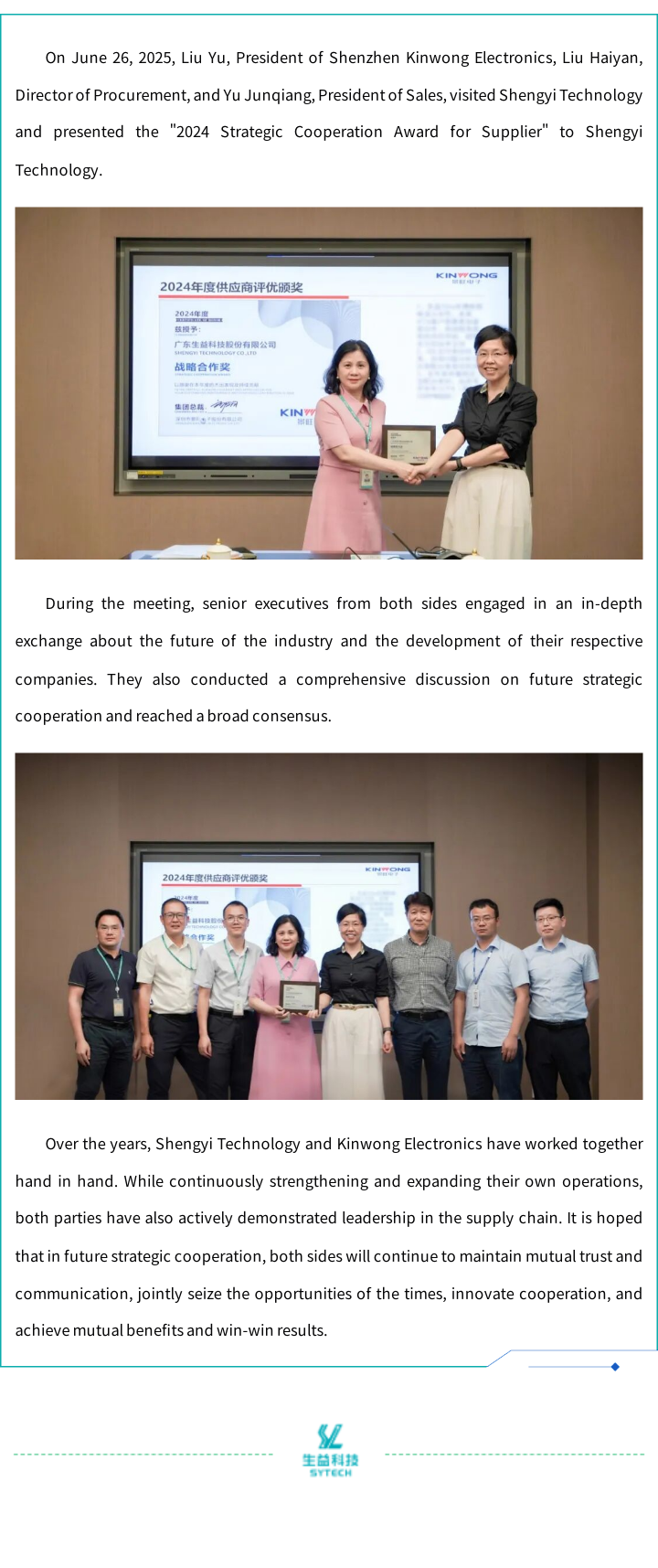 Shengyi Technology Wins the "Strategic Cooperation Award for Supplier" from Kinwong Electronics