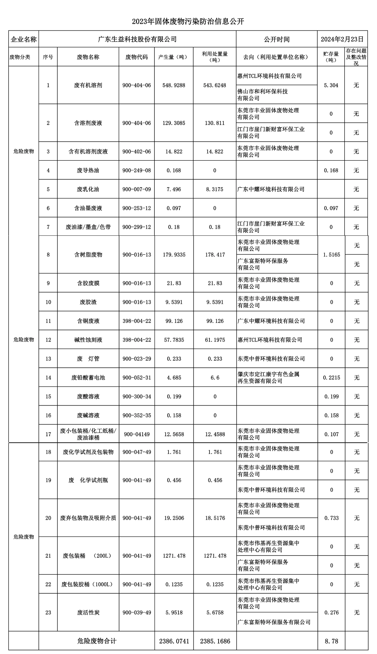 广东必一运动科技股份有限公司2023年危险废物污染防治责任信息公开